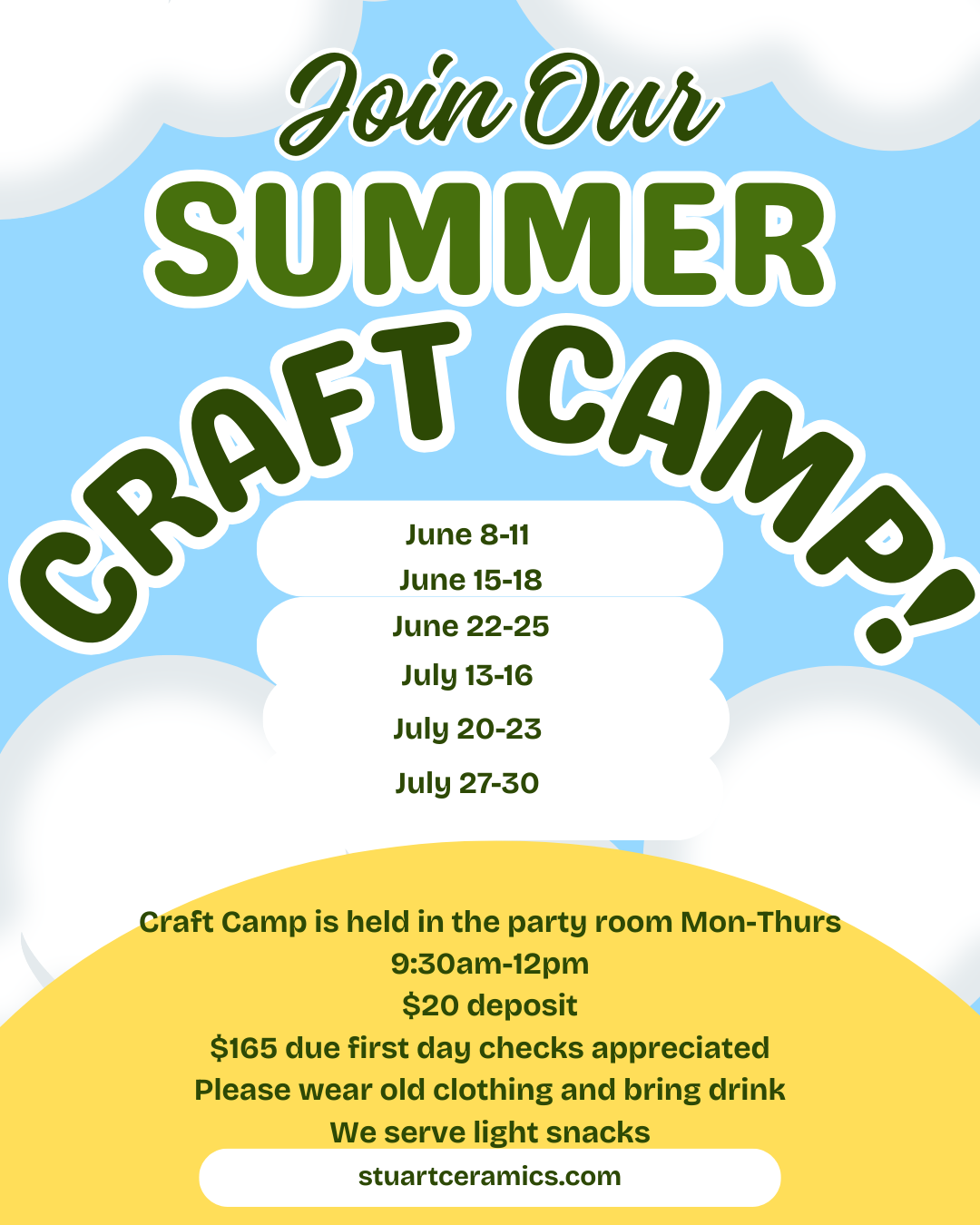 Call, make a reservation below or Email us at stuartceramics123@gmail.com to Book Your Time :-)
