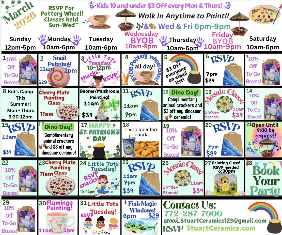 Lucky You! We are having a St. Patricks Day party! Join us for after hours painting, mosaics, $7 off pottery lessons and more!! BYOB!